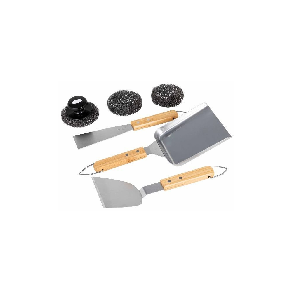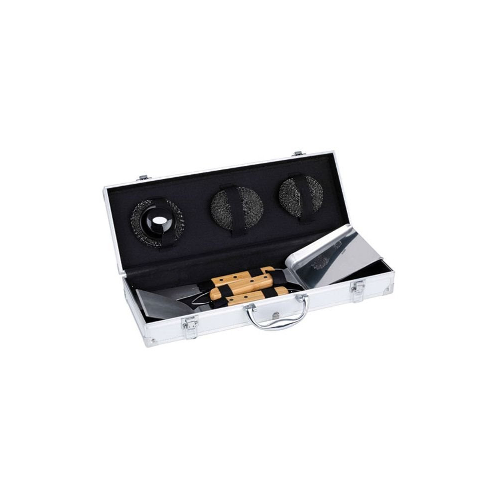 Valisette 6 accessoires Spécial plancha - Cette valisette regroupe les ustensiles essentiels pour une cuisson à la plancha parfaitement maîtrisée et un nettoyage impeccable en suivant ! - Valisette en aluminium - Comprend 1 pelle à légumes ou à fruits de mer, 1 spatule pour retourner les aliments, 1 grattoir pour nettoyer la plancha en raclant la surface de cuisson et 1 brosse avec poignée avec 2 brosses de rechange - Les manches des accessoires sont en bambou avec anneau de suspension - Garanti