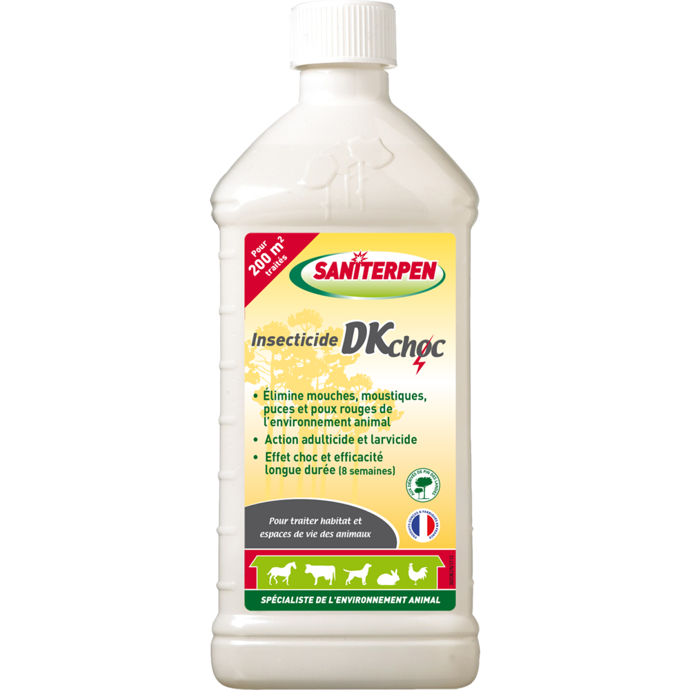 Protégez l'environnement de vie de vos animaux avec le Saniterpen Insecticide DK Choc 1L parfum Pin des Landes, un insecticide puissant à double action qui allie efficacité immédiate et protection durable. Spécialement formulé pour traiter les espaces fréquentés par les animaux domestiques, il offre un effet choc rapide complété par une protection prolongée jusqu'à 3 mois après application.