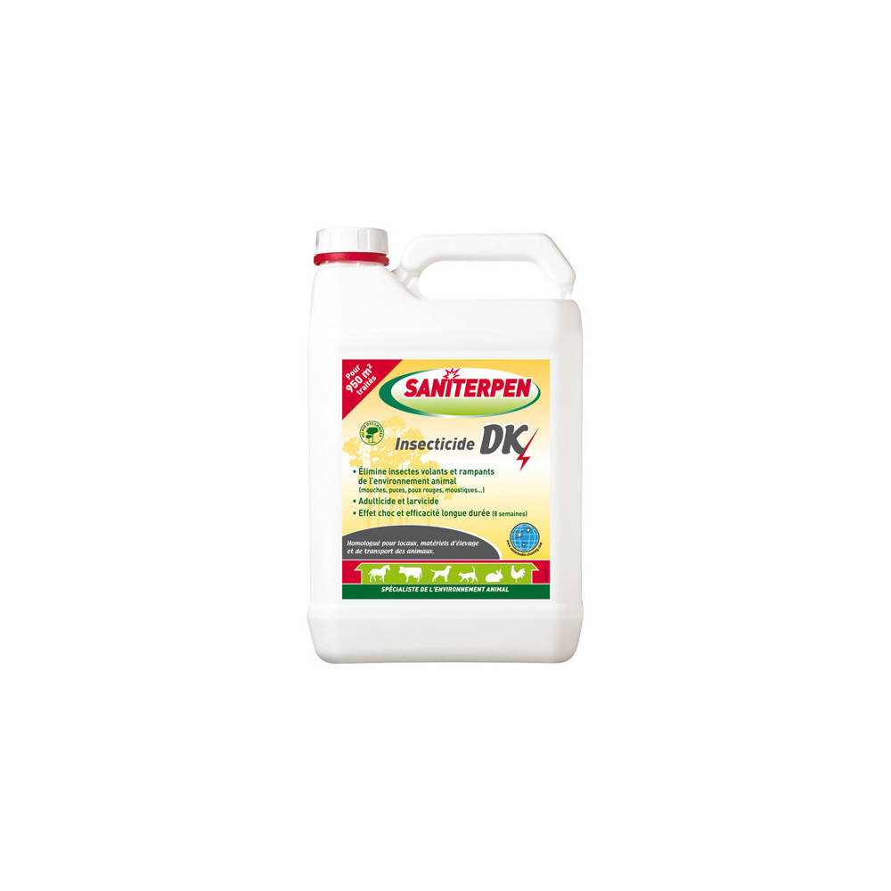 Pour faire face aux infestations importantes ou traiter de grandes surfaces, le Saniterpen Insecticide DK Choc 5L Pin des Landes TP18 est le format professionnel par excellence. Puissant concentré adulticide et larvicide, il agit à la fois sur les insectes adultes et leurs larves, garantissant une élimination en profondeur des populations parasitaires dès le premier traitement.