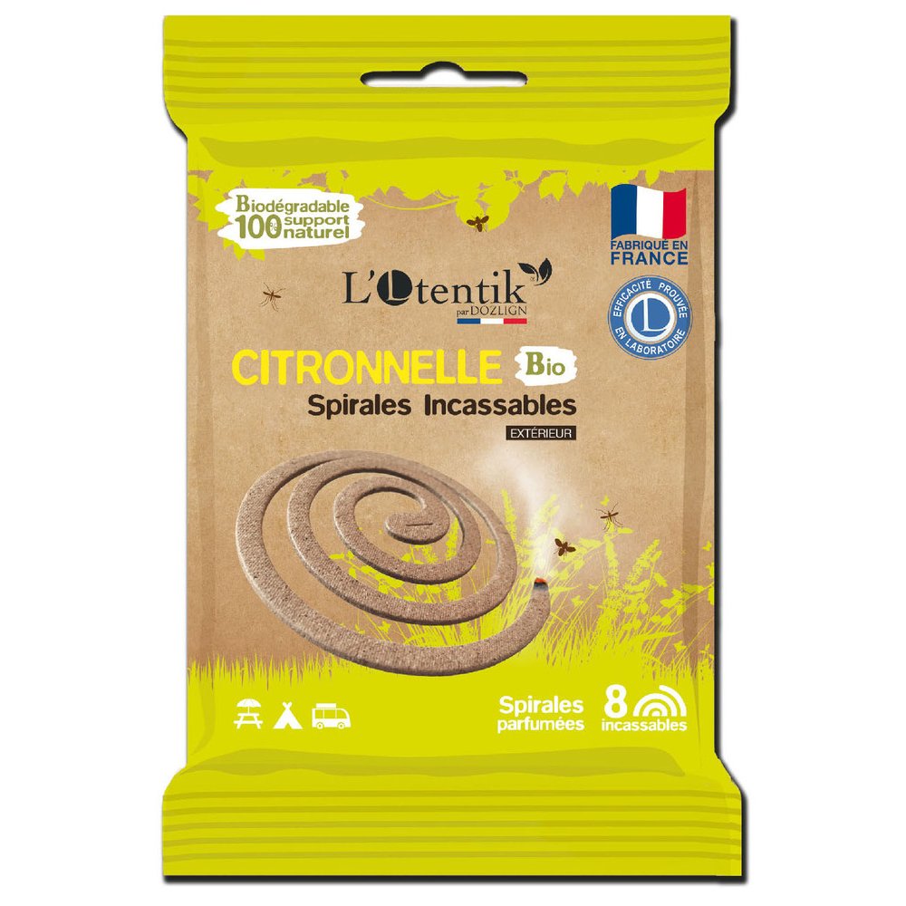 Sachet de 8 spirales naturelles L'Otentik composées de citronnelle bio avec un support métallique. | A utiliser en extérieur pour éloigner moustiques et insectes volants, en camping, en randonnée, sur le balcon ou sur la terrasse. | Répulsif à usage ménager. Spirales incassables