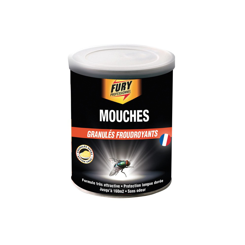 Pour lutter efficacement contre les proliférations de mouches, les Granulés Foudroyants FURY en boîte de 400 g constituent une solution de référence alliant praticité, discrétion et puissance d'action. Cet appât innovant attire irrésistiblement les mouches grâce à sa formule hautement attractive, déclenchant une action choc rapide dès le contact.