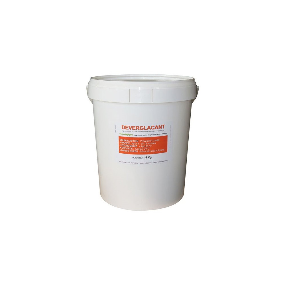 Le déverglaçant en seau de 5 Kg de chez Dousselin est jusqu'à 10 fois plus efficace que le sel. Il est aussi plus écologique. Le déverglaçant est sans danger pour l’homme, inoffensif sur la faune et la flore, non corrosif pour les supports. Le produit est 2 en 1 : Préventif et curatif. Action rapide agit en moins de 15 minutes. Economique 10 Kg pour 250 m². Efficace jusqu'à - 30°C. L'effet est longue durée, efficacité jusqu'à 5 jours. Les doses à utiliser pour 10 m² de surface sont : 200 g pour