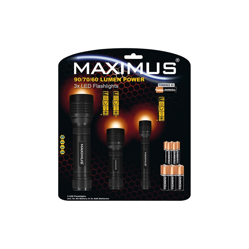 Avec ce lot de 3 lampes torches Maximus de 60, 70 et 90 lumens, équipez toute votre maison ou votre famille en éclairage de secours à petit prix. Ces torches compactes et fiables, disponibles en finition noire en ABS robuste, sont parfaites pour faire face aux coupures de courant, les sorties nocturnes ou les situations d'urgence.