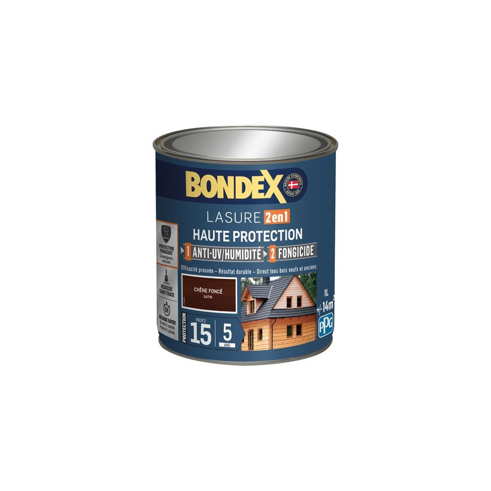 La lasure Bondex 2 en 1 teinte chêne foncé en 1 litre combine en un seul produit protection et décoration pour tous vos supports bois extérieurs. Formulée pour les milieux tempérés et humides, elle offre une protection longue durée de 5 ans contre les agressions climatiques les plus courantes, tout en sublimant le grain naturel du bois.