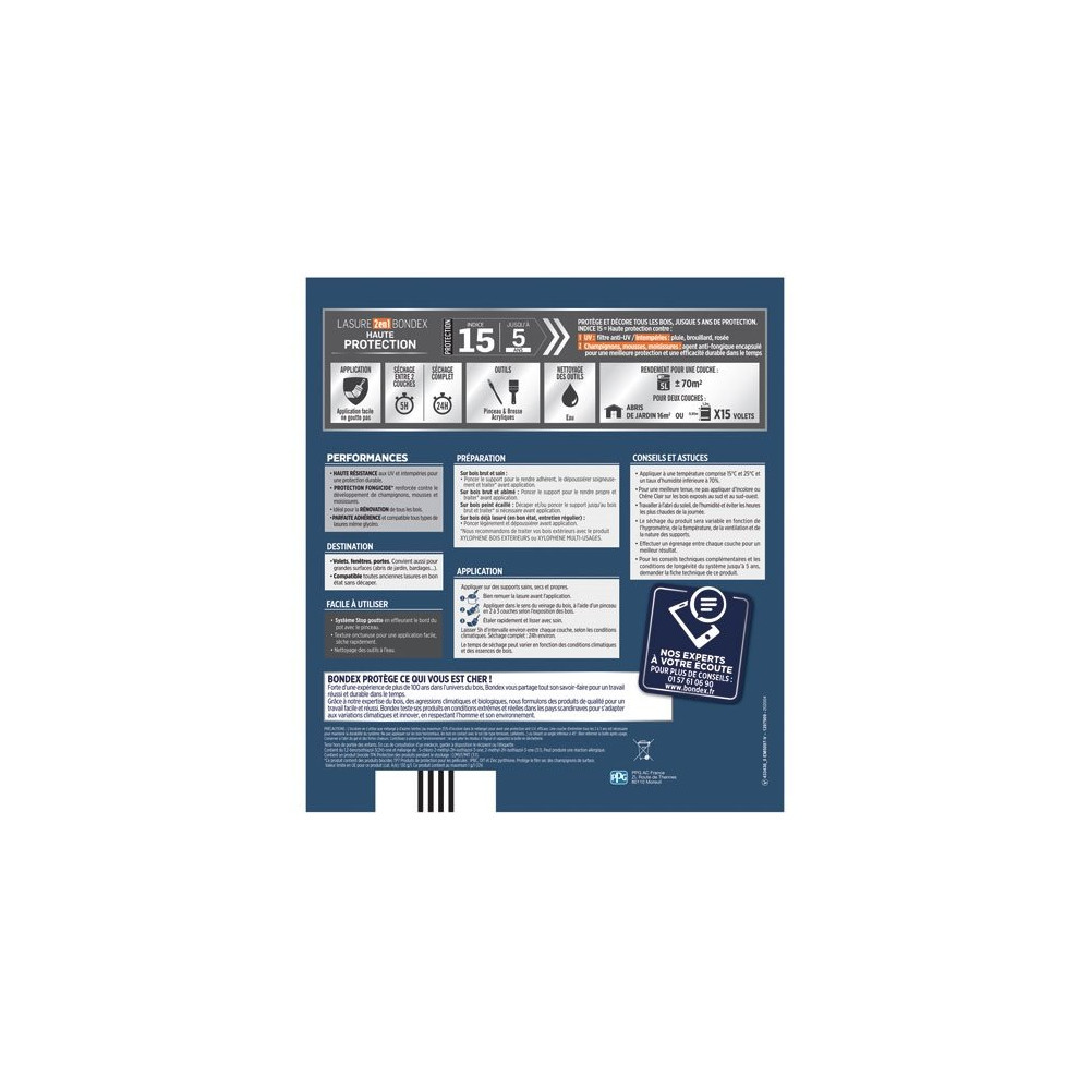 La lasure 2 en 1 de chez Bondex, protège et décore les bois bruts, anciens ou lasurés. Formule onctueuse anti-goutte qui offre une bonne pénétration du produit dans le support. | Fongicide encapsulé pour une libération progressive et continue de lactif fongicide en fonction des contraintes climatiques telles que pluie, brouillard, rosée (protection fongicide en surface du film sec contre le développement des champignons). Anti-UV (protège le bois contre les rayons solaires, à lexception de lincolore et du chêne clair). | Protection jusquà 5 ans. Utilisable en intérieur et en extérieur.