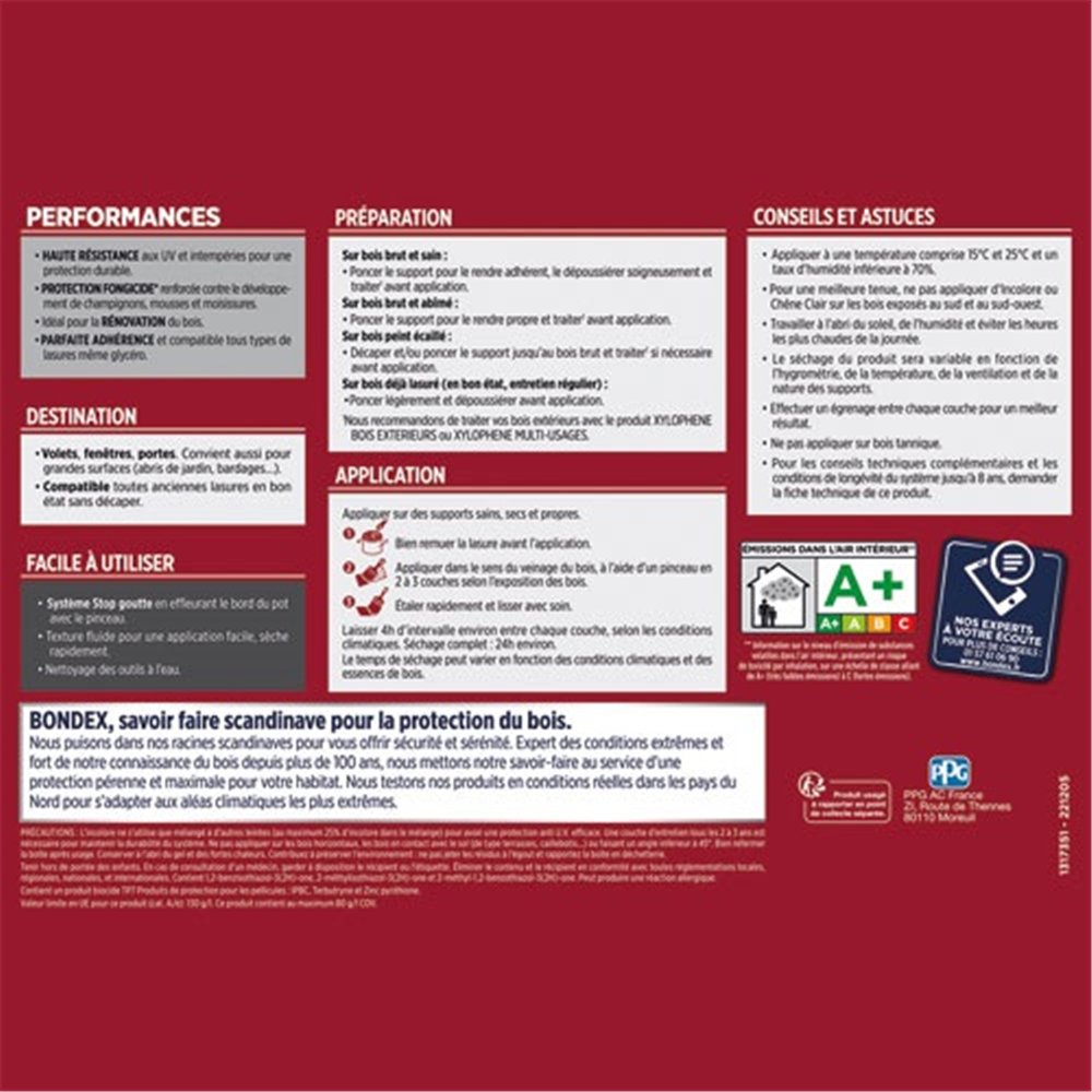 Disponible ici en version incolore, cette lasure est particulièrement adaptée aux bois dont vous souhaitez conserver la couleur naturelle sans altération. Recommandée pour toutes les expositions — y compris les façades plein sud et les environnements côtiers ou montagneux —, elle protège volets, portes, fenêtres, abris de jardin et bardages sur tous types de bois, neufs ou anciens.
