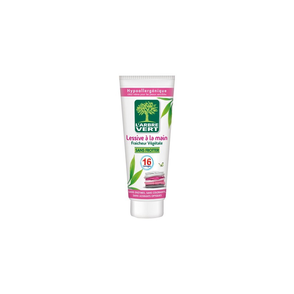 La lessive à la main L'Arbre Vert en tube vert est formulée spécialement pour prendre soin de vos vêtements délicats, ceux portant l'indication « lavage à la main » sur leur étiquette. Son format compact de 16 lavages en fait une alliée idéale pour les petites quantités de linge, que ce soit au quotidien ou lors de vos déplacements.