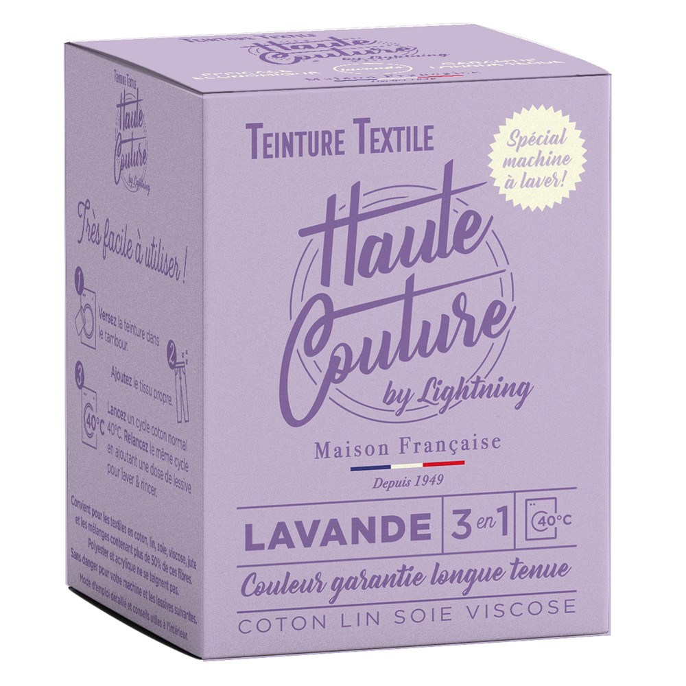 Sur des textiles blancs ou très clairs, la nuance lavande s'exprimera pleinement avec toute sa profondeur. Sur des tissus déjà colorés, le résultat sera différent selon la teinte de base : pensez à faire un test sur un petit morceau avant de teindre toute la pièce. Retrouvez la gamme complète de teintures Haute Couture 350 g disponible chez Brikoleur.