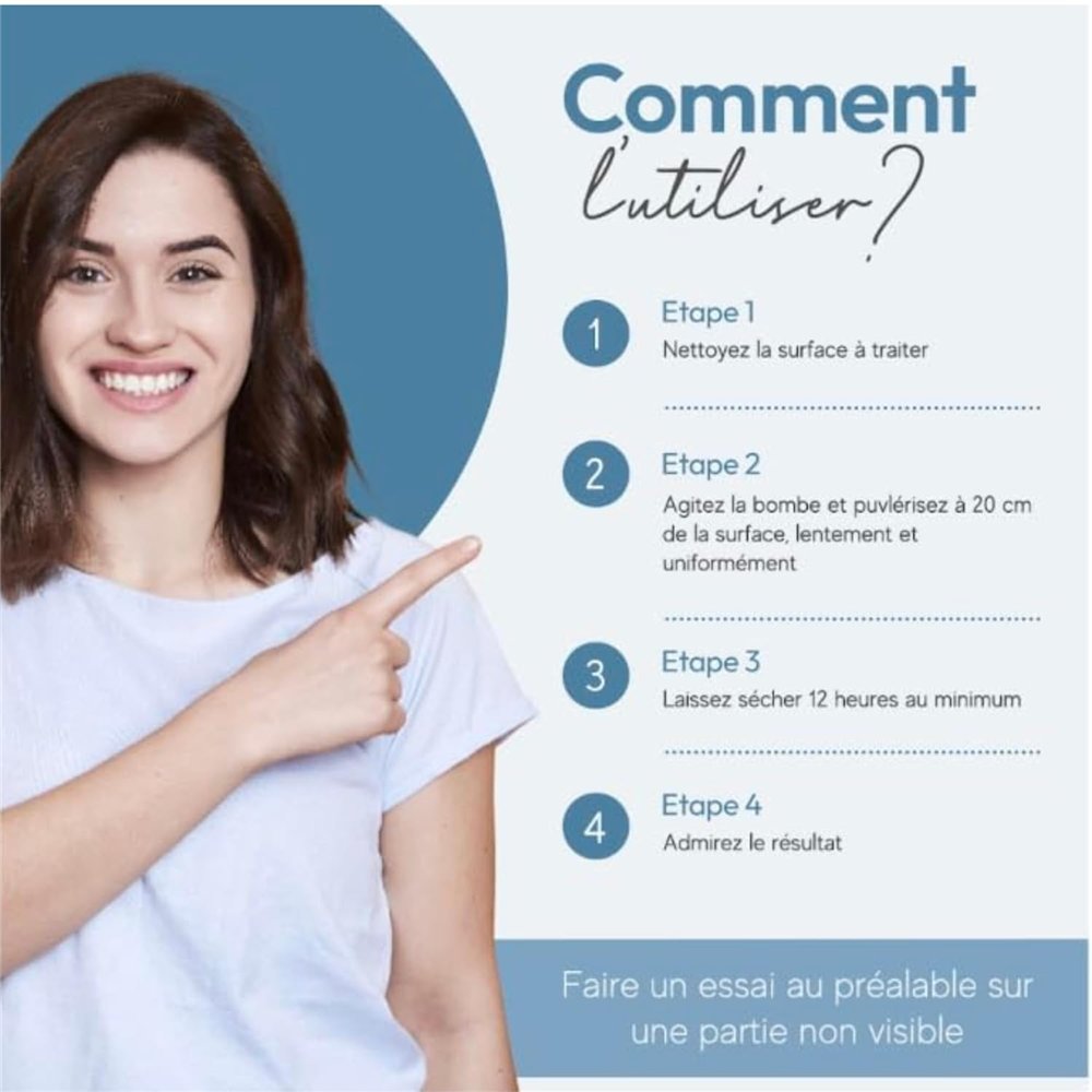 L'application est simple et rapide : vaporiser uniformément à environ 20-25 cm de la surface, laisser sécher à l'air libre. Le film protecteur formé est invisible, inodore une fois sec, et préserve intégralement l'esthétique de vos articles. Idéal avant la saison des pluies pour préparer vos chaussures et vêtements favoris.