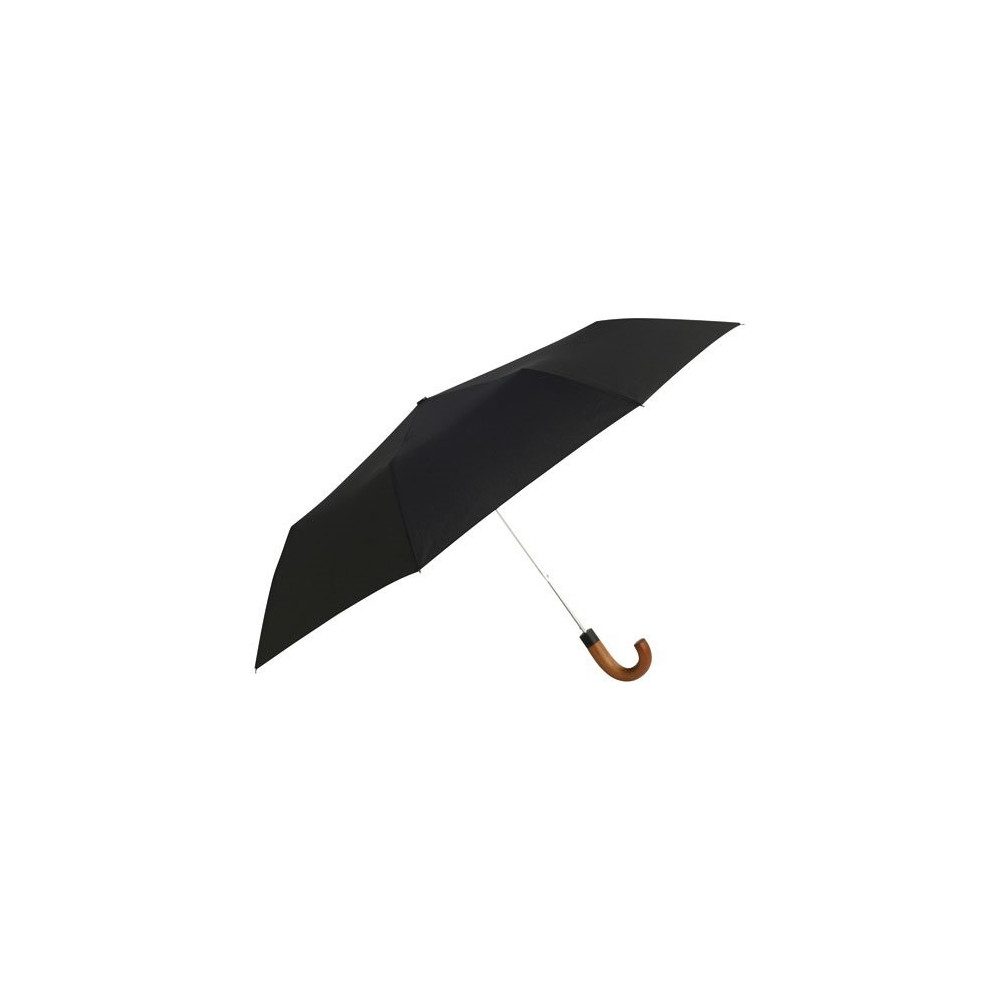 Parapluie homme pliant automatique noir avec poignée courbe bois et monture légère.