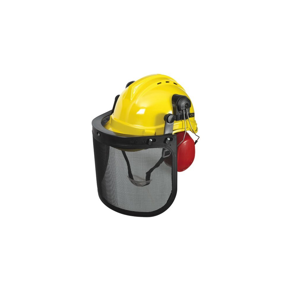 La visière grillagée en nylon offre une protection efficace contre les projections de débris, copeaux et branchages tout en maintenant une excellente visibilité. Les oreillettes antibruit réglables en hauteur sont équipées de coussinets pour un confort d'utilisation prolongé, et peuvent être escamotées quand elles ne sont pas nécessaires. Le serre-tête en plastique réglable, doté d'un bandeau de confort, permet d'ajuster le casque à morphologies différentes pour un maintien sûr et stable.