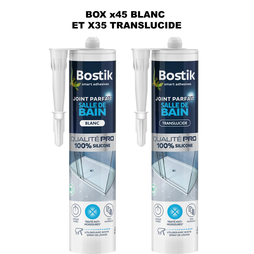 Ce présentoir display BOSTIK Joint Parfait Salle de Bain est un conditionnement mixte conçu pour les professionnels et les revendeurs souhaitant disposer d'une offre complète d'étanchéité en pièces humides. Il regroupe 45 cartouches blanches et 35 cartouches transparentes, toutes au format 280 ml, pour couvrir l'ensemble des configurations de chantier.