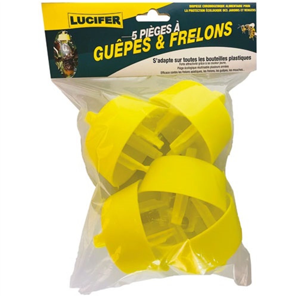 Protégez vos repas en extérieur et vos espaces de vie avec les pièges à guêpes Lucifer pour bouteille plastique, vendus en sachet de 5 unités. Une solution écologique, ingénieuse et particulièrement efficace pour lutter contre les guêpes et les frelons sans insecticides ni produits toxiques pour l'environnement.