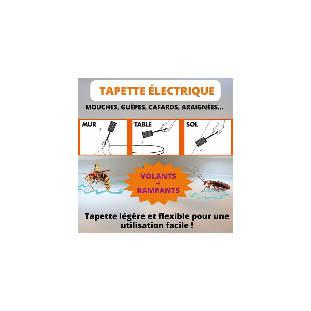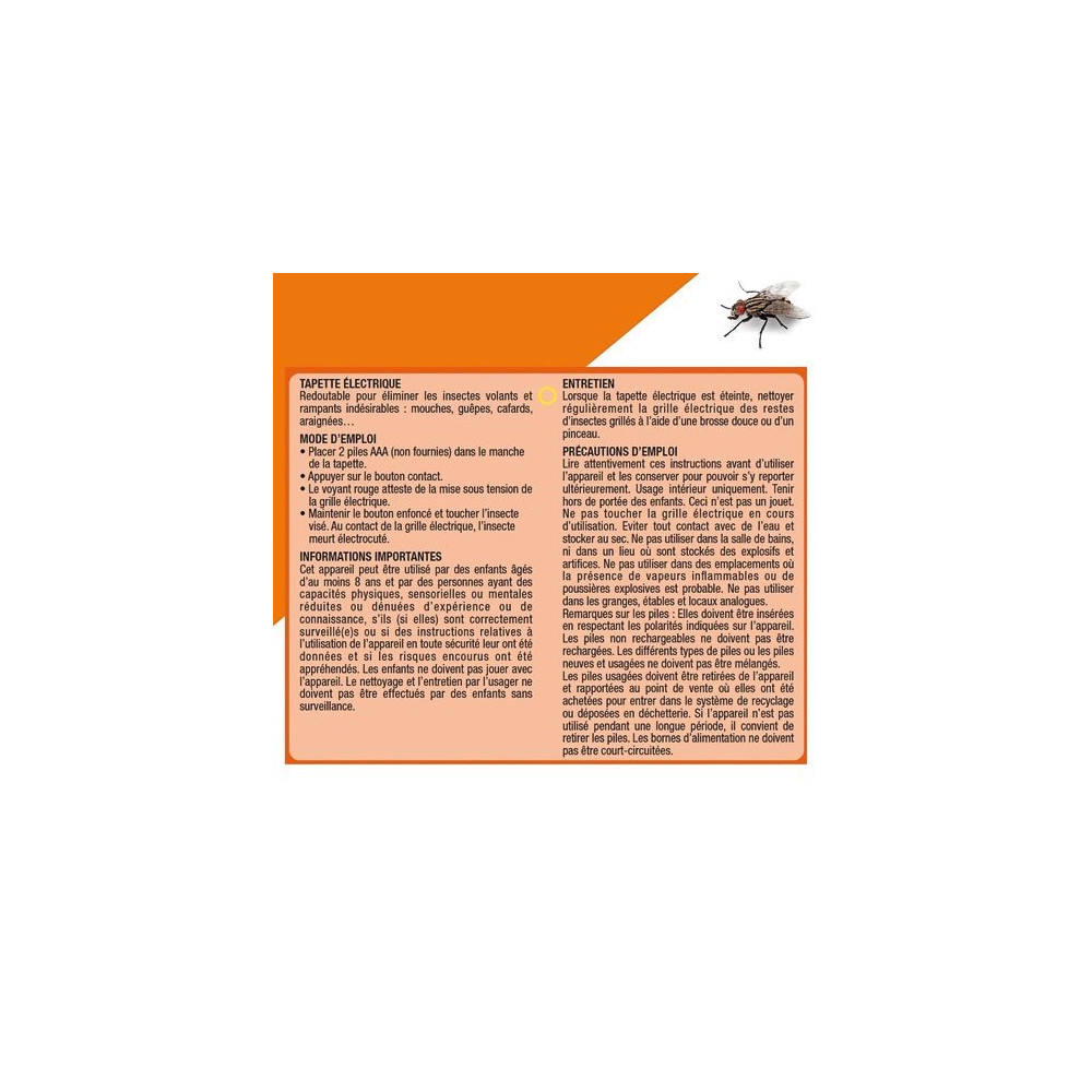Redoutable contre les insectes volants et rampants : mouches, moustiques, cafards, araignées Légère, souple et silencieuse. Simple d utilisation : au contact de la grille, l insecte meurt électrocuté.Fonctionne avec 2 piles AAA non fournies.