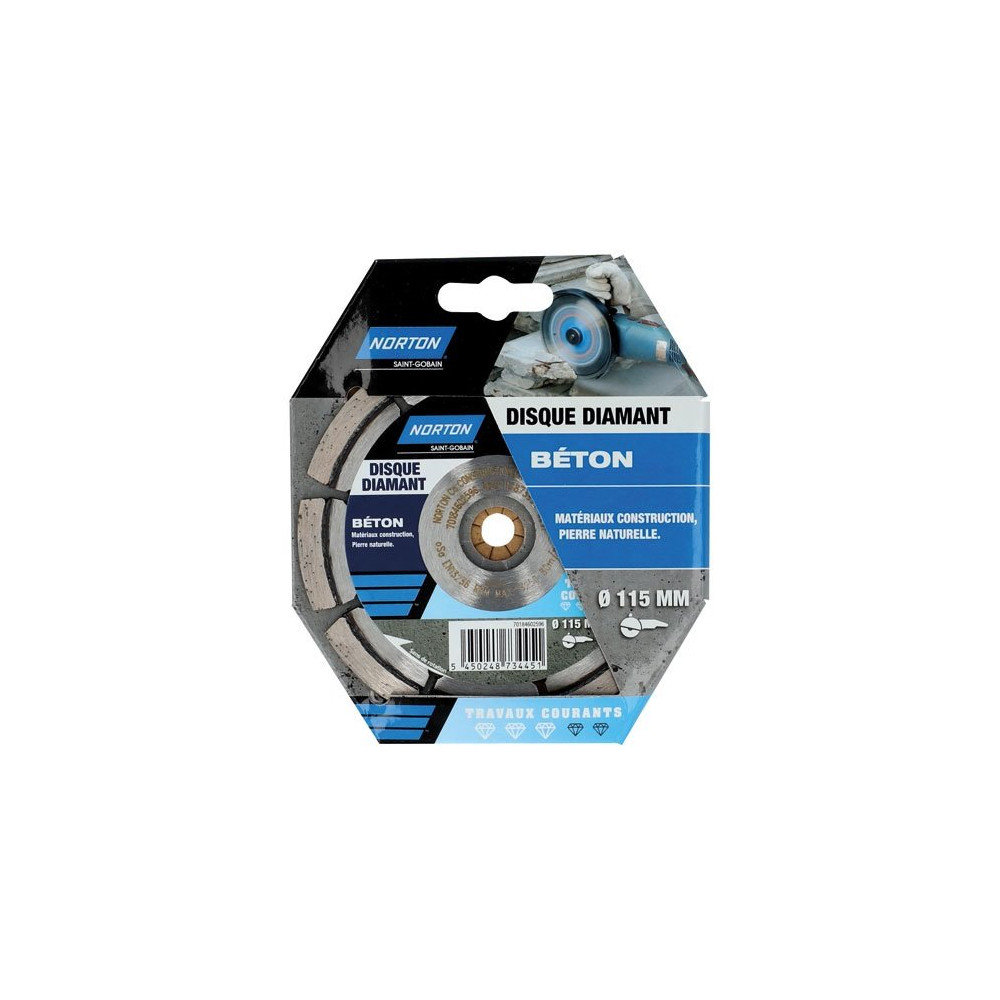 Le disque diamant Norton 115 x 22,23 mm pour travaux courants est la référence polyvalente pour tous les chantiers de maçonnerie et de construction. Monté sur meuleuse d'angle, il attaque sans effort le béton, la pierre naturelle et les matériaux de construction courants avec une régularité de coupe appréciable.