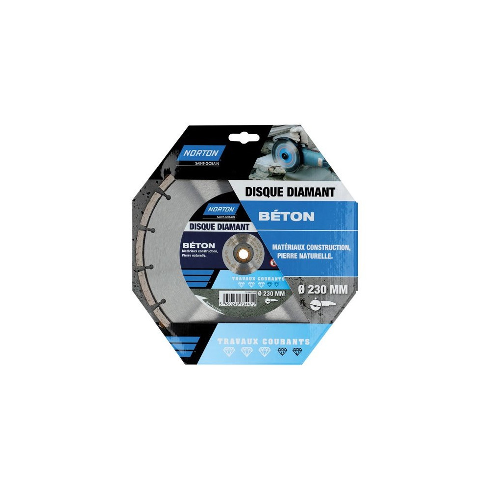 Pour les travaux de découpe exigeants sur chantier, le disque diamant Norton 230 x 22,23 mm travaux courants offre une surface de coupe généreuse adaptée aux grandes épaisseurs de matériaux. Compatible avec les meuleuses d'angle 230 mm, il s'impose dans les opérations de maçonnerie, de construction et de rénovation lourde.