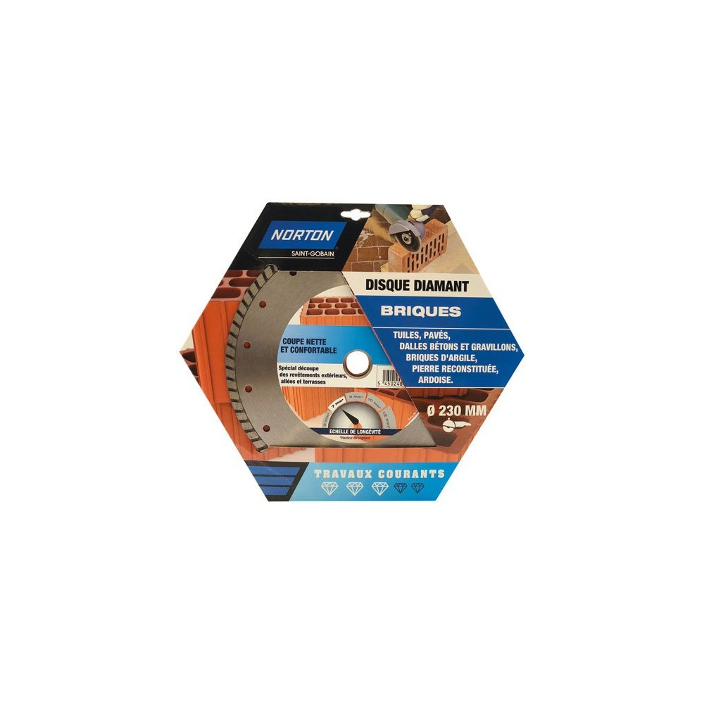 Le disque diamant 230 x 22.23 millimètres travaux courants brique en lot de 1 de chez Norton a une coupe rapide et sans éclats. Spécial découpe des revêtements extérieurs, allées et terrasses. Segment d’une hauteur de 7mm. Pour la découpe de briques, tuiles, pavés, briques d'argiles, dalles bétons et gravillons, pierres reconstituées et ardoises.