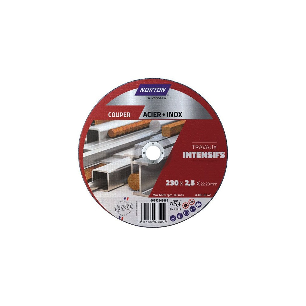 Avant toute utilisation, vérifiez la vitesse maximale admissible inscrite sur le disque et comparez-la à celle de votre meuleuse. Un équipement de protection complet — lunettes, masque, gants et protège-oreilles — est indispensable. Pour les professionnels comme pour les bricoleurs avertis, ce disque Norton 230 mm est une valeur sûre.