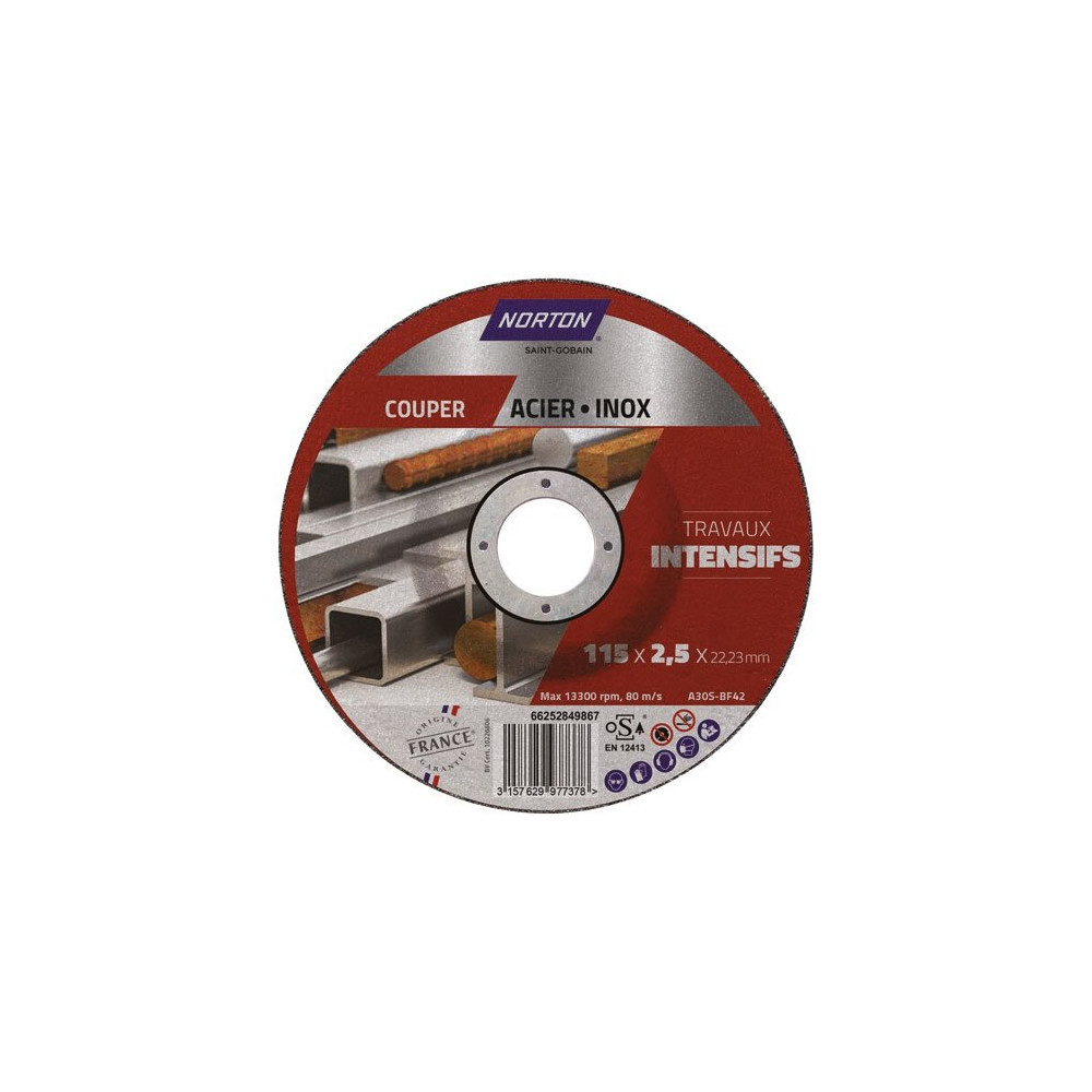 Pour les travaux de découpe exigeants sur métal, le disque à tronçonner Norton 115 x 2,5 x 22,2 mm s'impose comme un choix de référence. Spécifiquement étudié pour les travaux intensifs sur acier et inox, ce disque à moyeu déporté (forme 42) assure une coupe précise et sécurisée sur meuleuse d'angle standard.