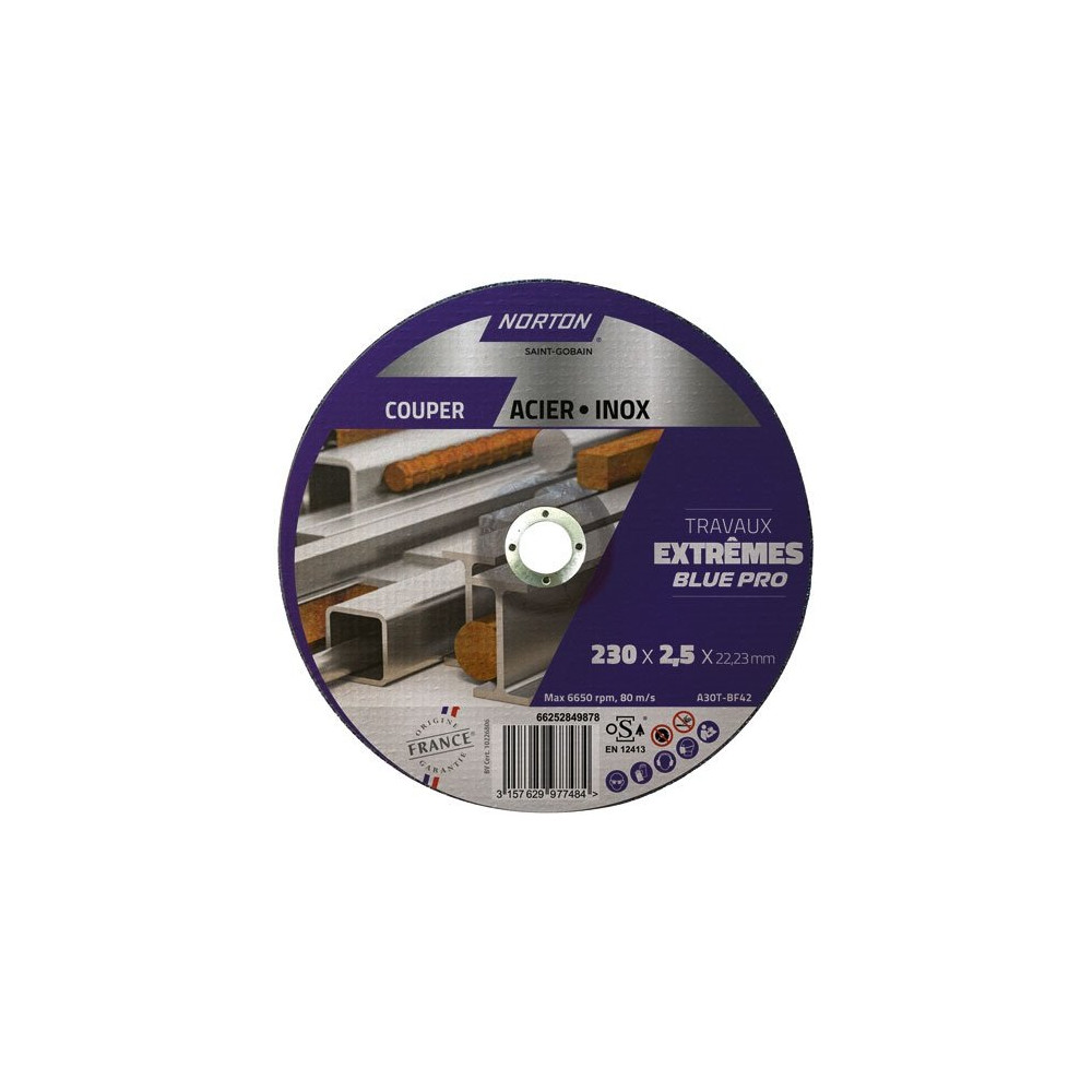 Le disque à tronçonner Norton Blue Pro Extreme 230 x 2,5 x 22,2 mm est un disque de qualité industrielle spécialement formulé pour la coupe de l'acier et de l'inox dans les conditions les plus exigeantes. Conçu à moyeu déporté (forme 42), il est compatible avec les meuleuses d'angle à grande vitesse et répond aux standards les plus élevés du secteur professionnel.