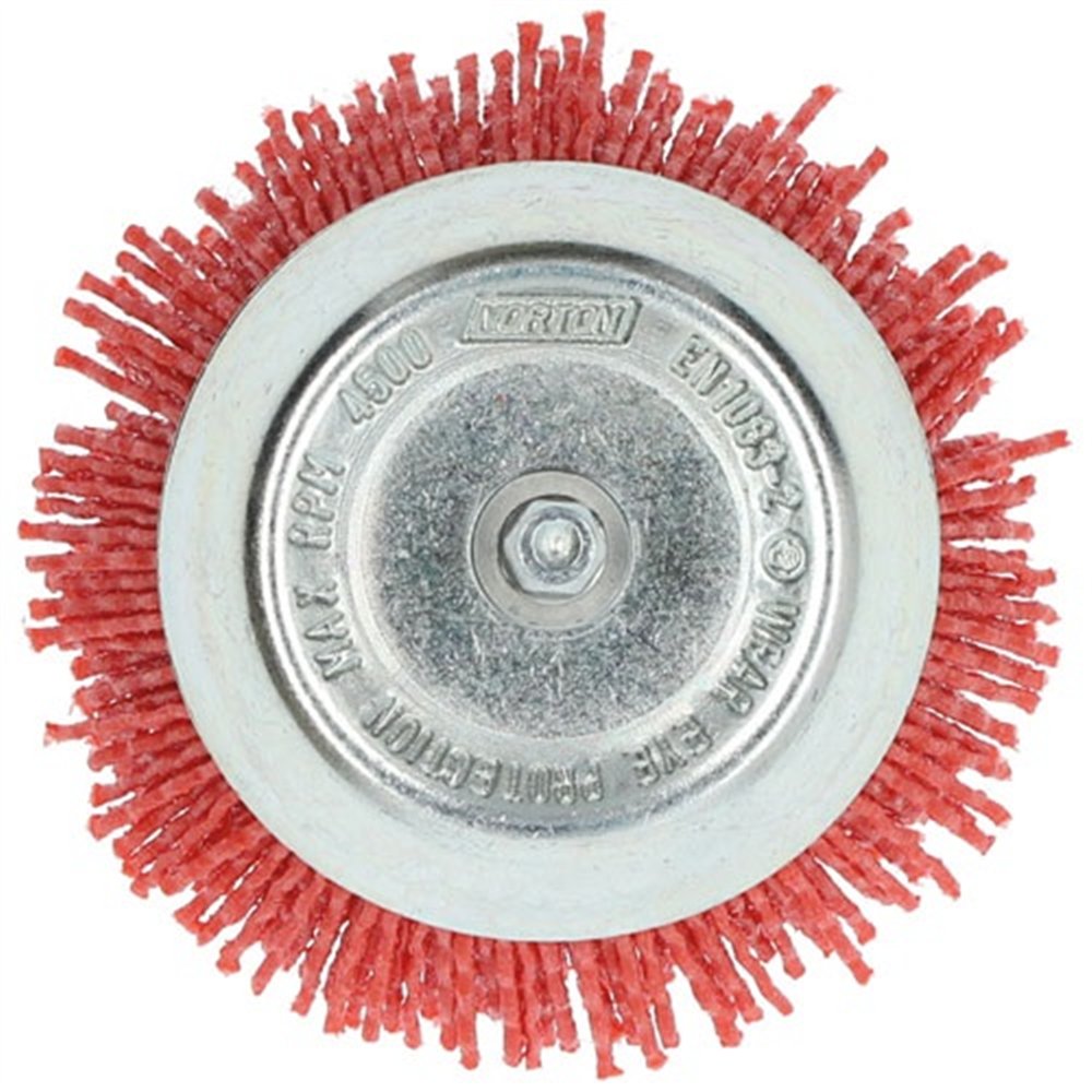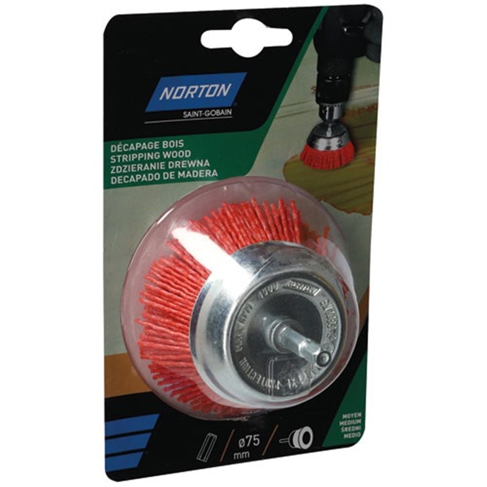 Pour obtenir les meilleurs résultats, travaillez à vitesse modérée (variable selon la dureté du bois) et maintenez la brosse en mouvement constant pour éviter les marques de chaleur ou de creusement localisé. Portez obligatoirement des lunettes de protection et des gants lors de l'utilisation. Pour un décapage moins agressif sur bois tendre ou vernis fins, Norton propose également cette brosse en version bleue.