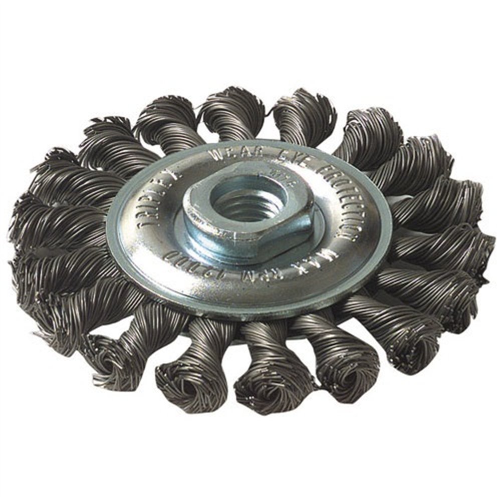 Cette brosse circulaire se distingue par ses fils d'acier torsadés d'une épaisseur de 0,50 mm. Plus épais que les fils ondulés, ils développent une puissance abrasive supérieure, particulièrement adaptée aux travaux agressifs : décapage de laque épaisse, élimination de rouille résistante, nettoyage de tubes et ébavurage de pièces usinées. La torsade des fils renforce leur robustesse et leur résistance à l'usure.