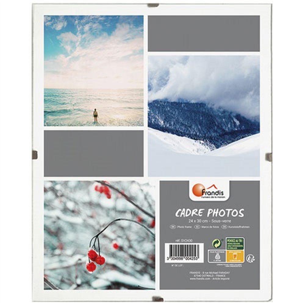 Le cadre sous verre Frandis 24x30 cm est une solution d'affichage à la fois fonctionnelle et soignée, idéale pour mettre en valeur vos documents, photographies, affiches ou illustrations préférées. Sa conception épurée s'intègre discrètement dans tous les styles d'intérieur, qu'il s'agisse d'un bureau, d'un couloir ou d'une pièce de vie.