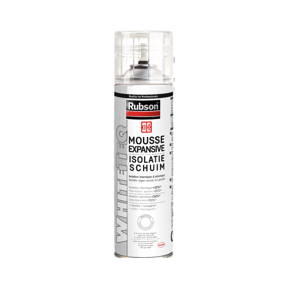 La Mousse Expansive Thermique et Phonique 500ml de Rubson est une solution professionnelle de calfeutrement à base de polyuréthanne (technologie WHITETEQ), conçue pour combler efficacement les espaces autour des menuiseries, des passages de tuyauteries et des ouvertures structurelles. Son durcissement par réaction avec l'humidité ambiante de l'air garantit un résultat solide et durable sans outil spécifique.