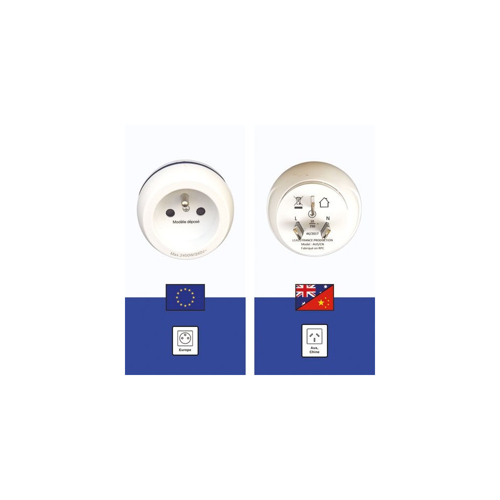 Préparez votre départ pour l'Australie ou la Chine sans vous soucier des prises électriques grâce à l'adaptateur LTE DESIGN France – Australie / Chine. Développé en France par la marque Leach Travel, cet adaptateur compact supporte une puissance maximale de 2400W sous 240V, suffisante pour alimenter vos appareils courants lors de vos voyages.