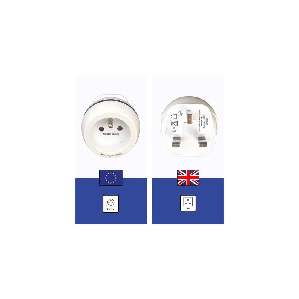 Cap sur la Grande-Bretagne sans laisser vos appareils électriques à la maison ! L'adaptateur 2P+T France – Grande-Bretagne LTE DESIGN est l'accessoire de voyage incontournable pour tout Français traversant la Manche. Il permet de brancher vos appareils français sur les célèbres prises britanniques à trois broches rectangulaires (type G), avec une puissance maximale impressionnante de 3120W sous 240V.