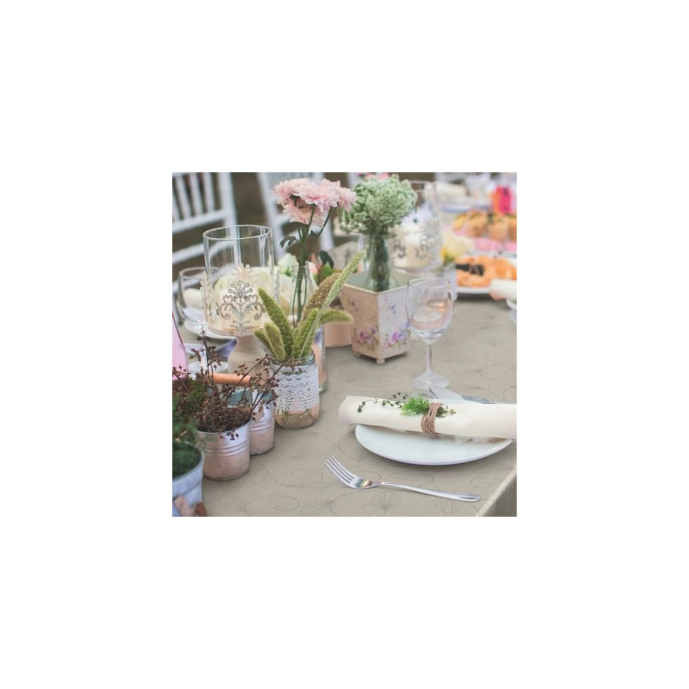 Sa conception en toile cirée moderne à gaufrage imitation tissu lui confère l'apparence chaleureuse d'une nappe en textile, tout en conservant tous les avantages du vinyle. La finition métallisée ajoute une subtile touche de brillance qui valorise la mise en scène de la table. La surface reste imperméable et résistante aux taches, pour une nappe aussi belle que fonctionnelle.