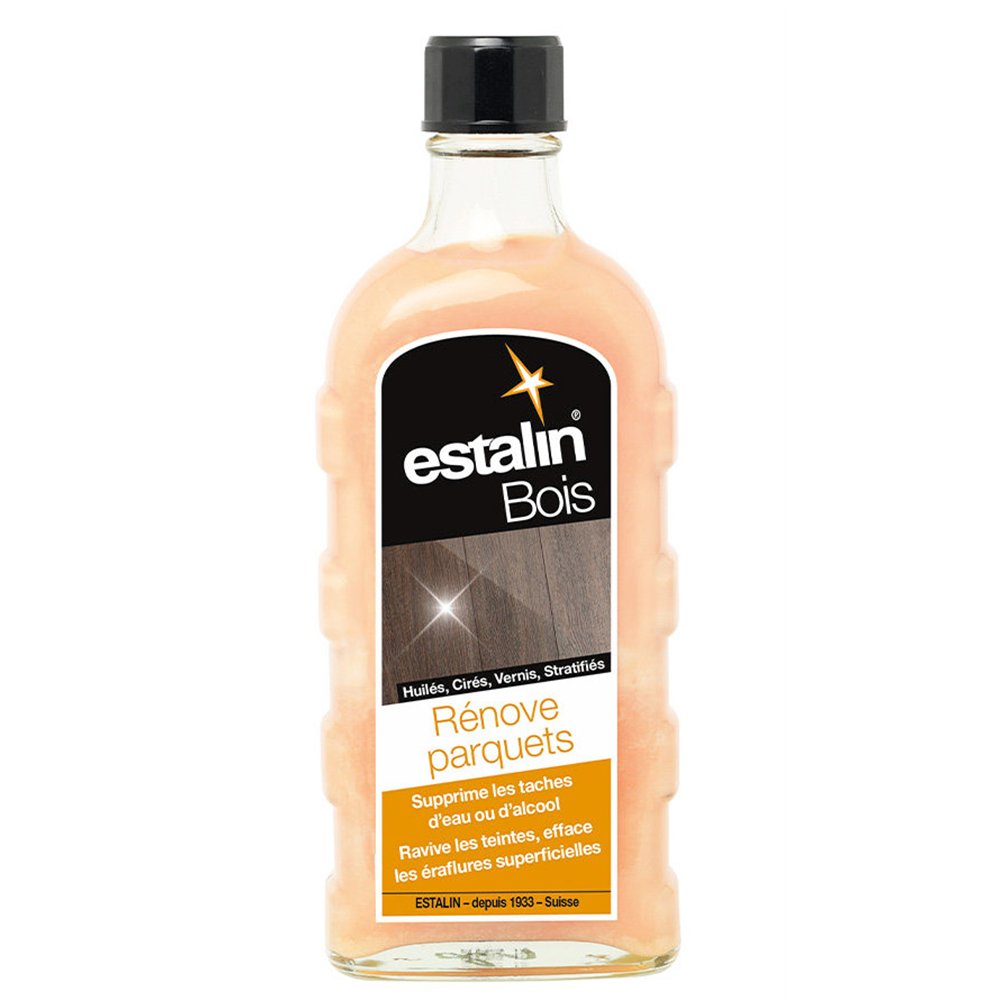 Redonne du lustre aux parquets en bois huilés, cirés, vernis ou stratifiés. | Estalin Rénove Parquets élimine les taches d'eau ou d'alcool, ravive les teintes et efface les éraflures superficielles. | En protégeant et ravivant les bois, il est particulièrement recommandé pour les surfaces stratifiées et vitrifiées, ainsi que pour tous types de bois vernis et modernes. | A utiliser mensuellement en appliquant la solution avec un chiffon doux, laissez sécher et faites briller.