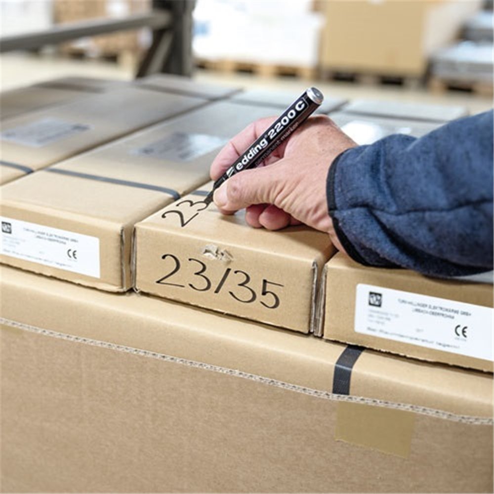 Robuste et polyvalent, le marqueur permanent Edding coloris noir est l'outil de marquage par excellence des ateliers, entrepôts et chantiers. Sa pointe biseautée offre une double capacité d'utilisation : trait fin d'1 mm en travaillant sur le côté biseauté, trait large jusqu'à 5 mm en utilisant la face plane, pour s'adapter à toutes les situations de marquage.