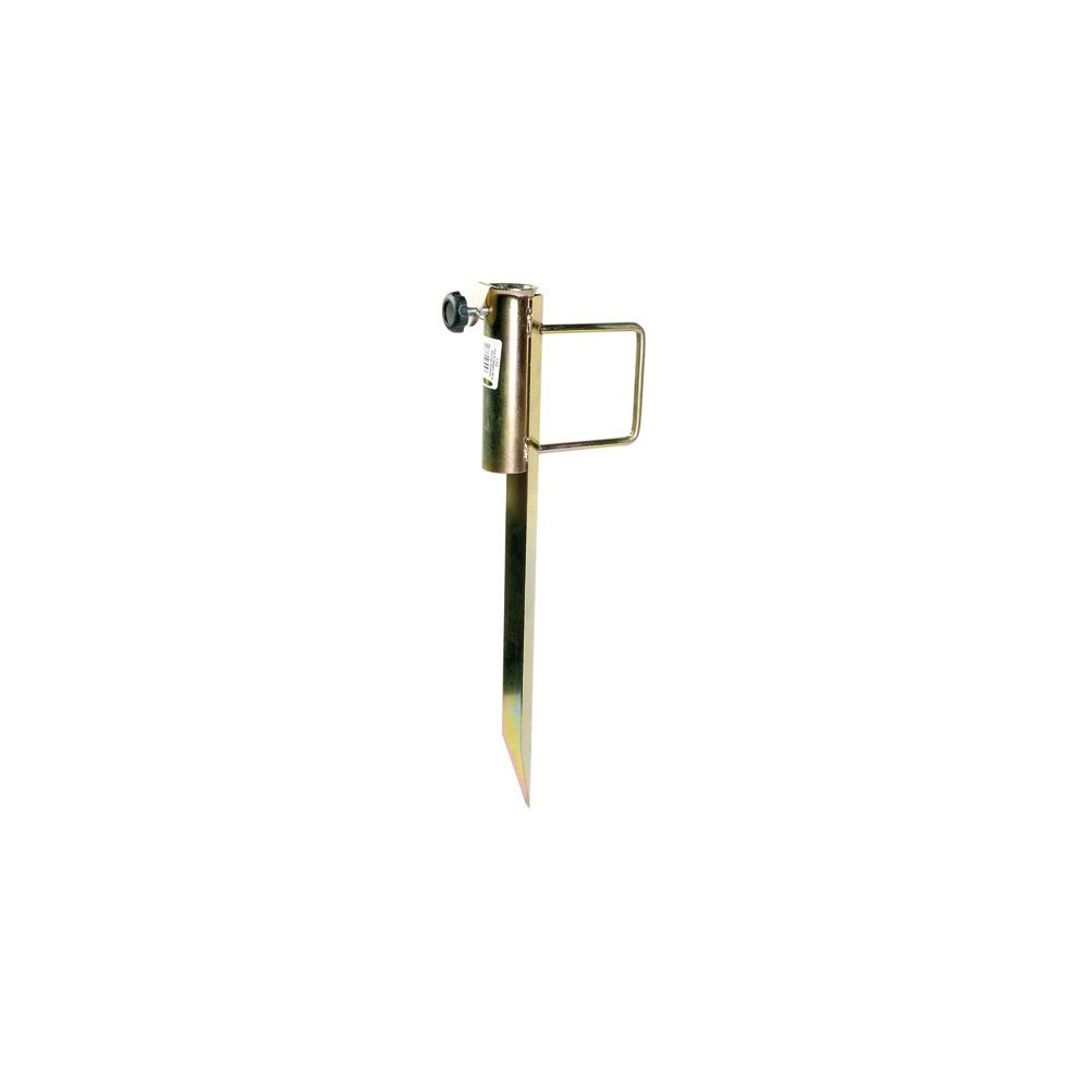 Fabriqué en métal robuste, ce pied présente une hauteur de 47 cm qui lui permet d'être planté solidement dans la terre ou un substrat meuble. Sa conception en pointe facilite l'enfoncement dans le sol sans nécessiter d'outillage spécifique, tandis que le système de serrage assure un maintien ferme du mât du parasol même par vent modéré.