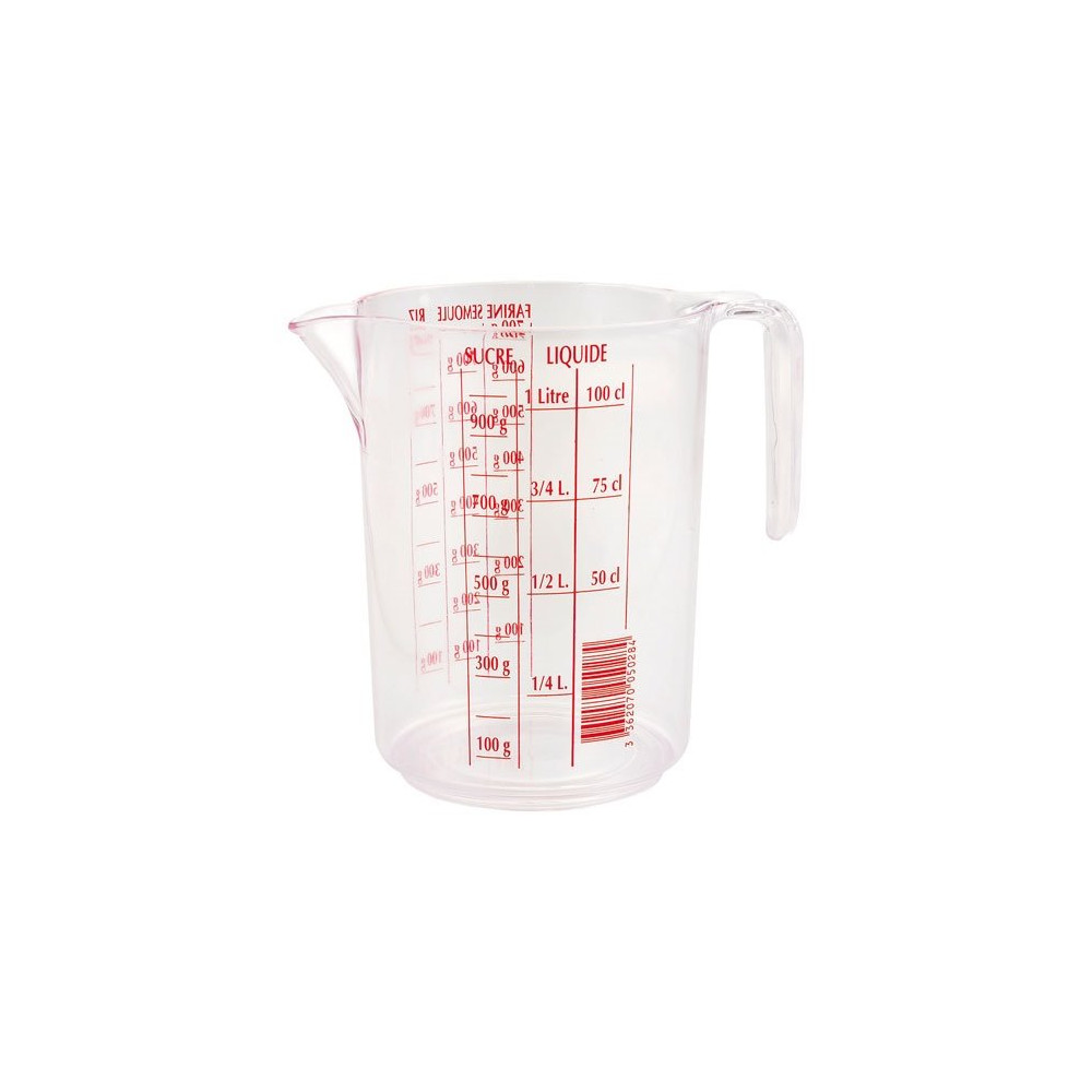 Fabriqué en polystyrène transparent, il permet de lire les graduations directement à travers la paroi sans avoir à incliner le pichet, ce qui garantit une mesure précise et sans erreur. Sa poignée ergonomique assure une prise en main sécurisée, même lorsque le pichet est plein, limitant le risque de renversement lors du versement.