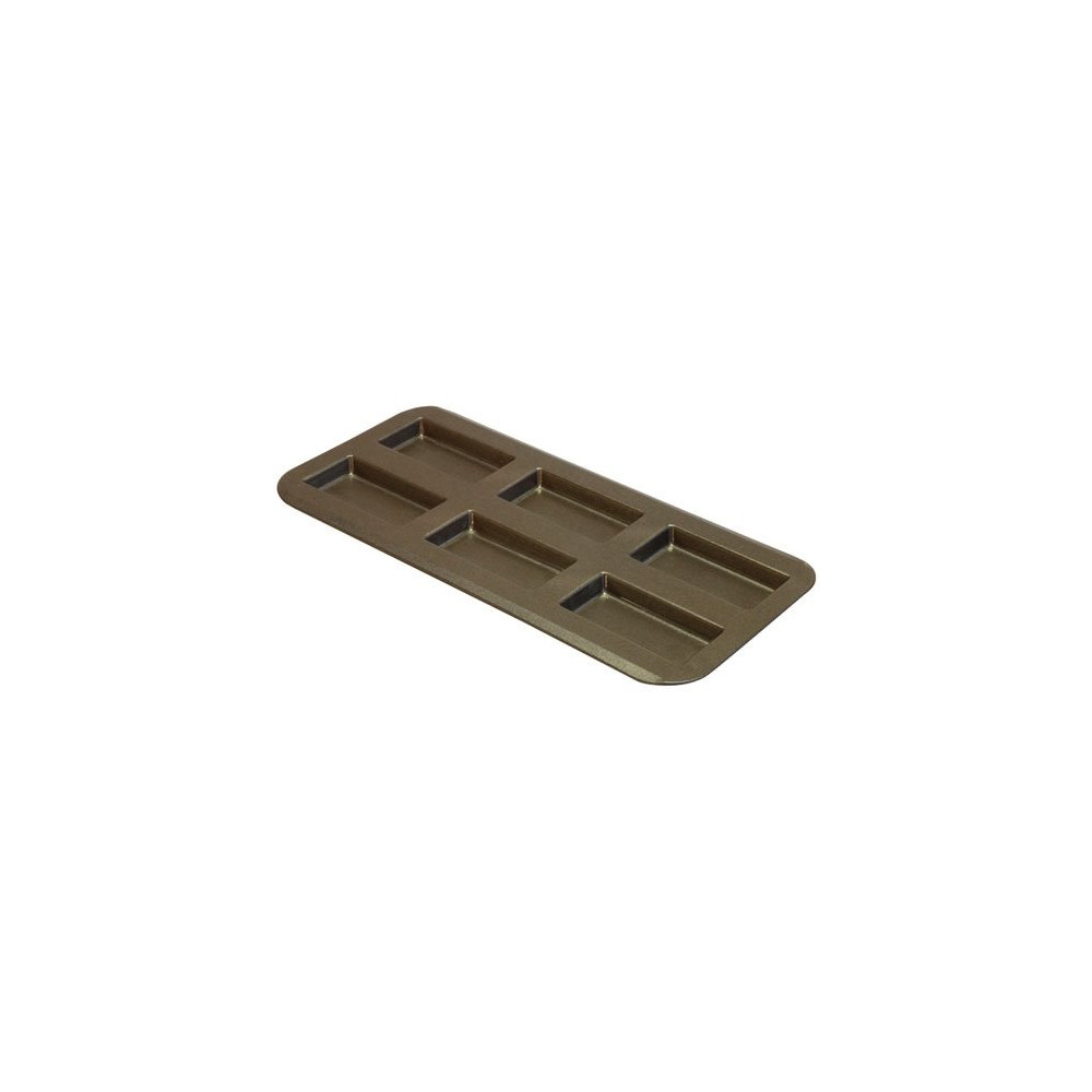 Plaque 6 financiers - Acier antiadhérent - Une gamme de moule de qualité professionnelle pour une cuisson et un démoulage parfaits ! - Grâce au revêtement antiadhérent, vos préparations se démouleront sans difficulté pour un résultat impeccable ! - Idéale pour la cuisson des financiers et des biscuits rose de Reims ! - En acier, d'une épaisseur de 0.5 mm : un moule robuste et durable - Revêtement antiadhésif bicouche renforcé en céramique - Démoulage parfait même sans utiliser de matière grasse