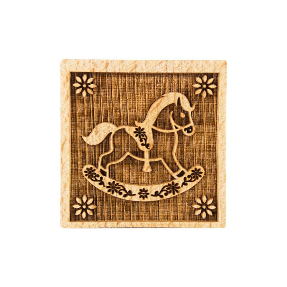 Ce tampon est fabriqué en bois de qualité avec une gravure profonde du motif Cheval à bascule, qui garantit une empreinte nette, détaillée et répétable à chaque biscuit. Sa forme carrée délimite précisément la surface du biscuit, et sa poignée ergonomique offre un confort d'utilisation optimal pour toute la famille.