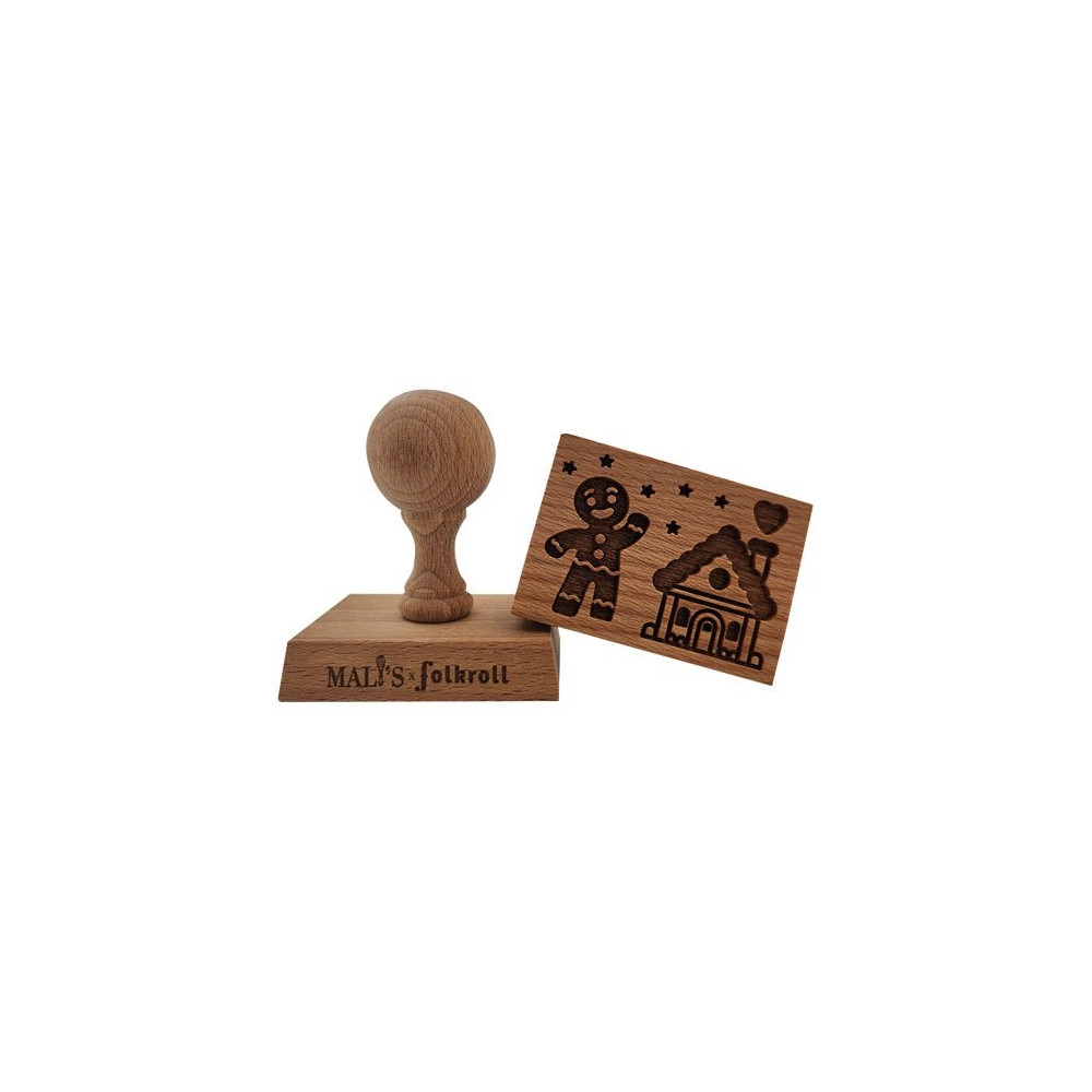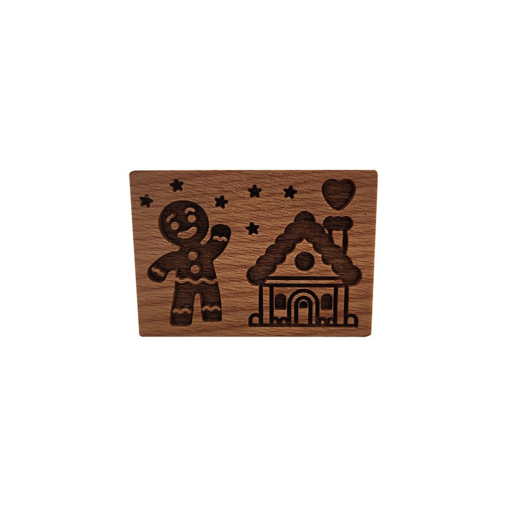 La gravure profonde dans le bois est la clé d'un résultat impeccable : elle retient parfaitement la pâte lors de l'application et restitue chaque détail du motif — bonhomme de pain d'épices et maison enneigée — avec une netteté remarquable après cuisson. La poignée ergonomique assure une prise en main confortable et une pression homogène sur toute la surface du tampon, même pour les plus petites mains.