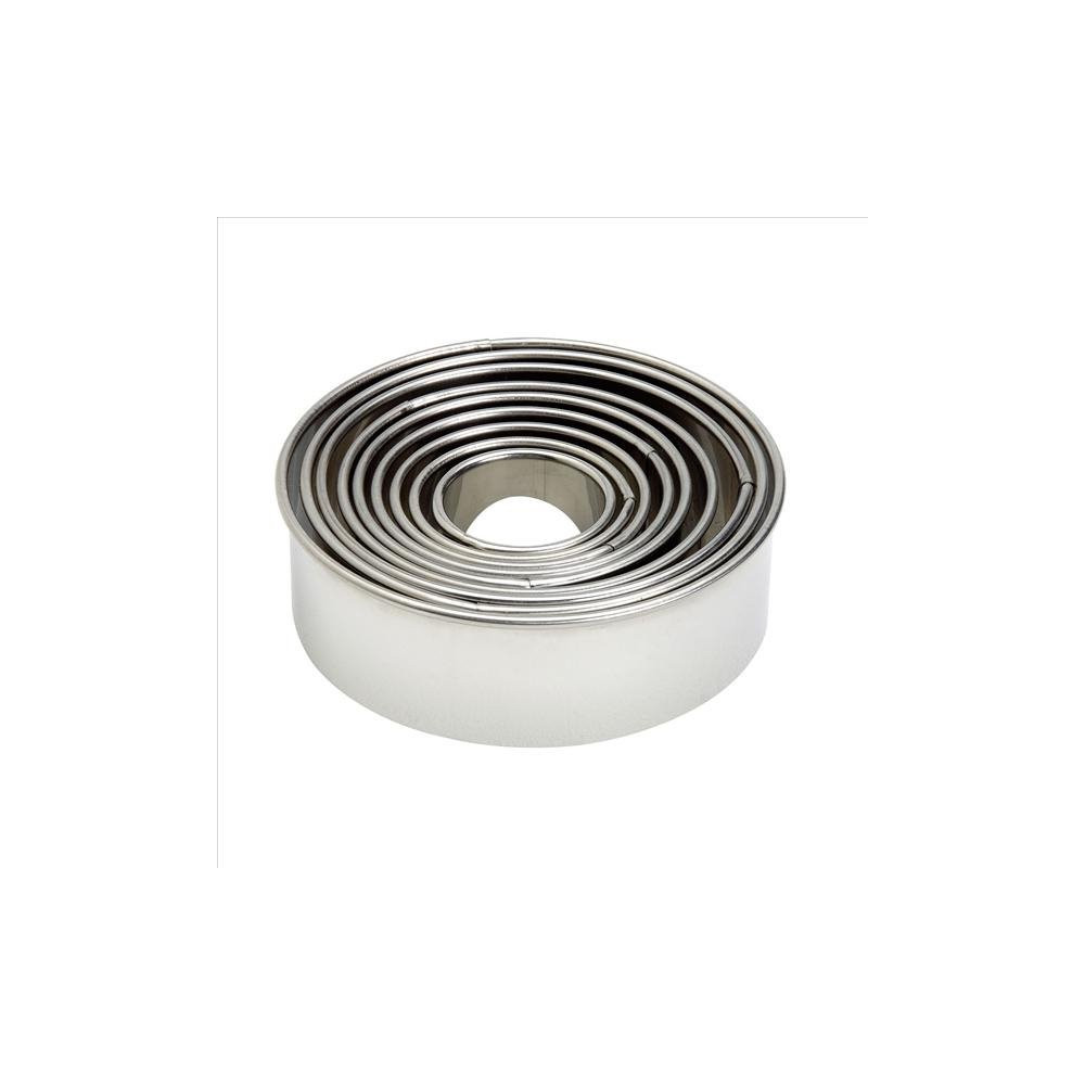 Découpoir rond uni de 9 emporte pièces Inox - Les différents diamètres sont 4 , 5 , 6 ,7 ,8 , 9 , 10 , 11 et 12 cm .