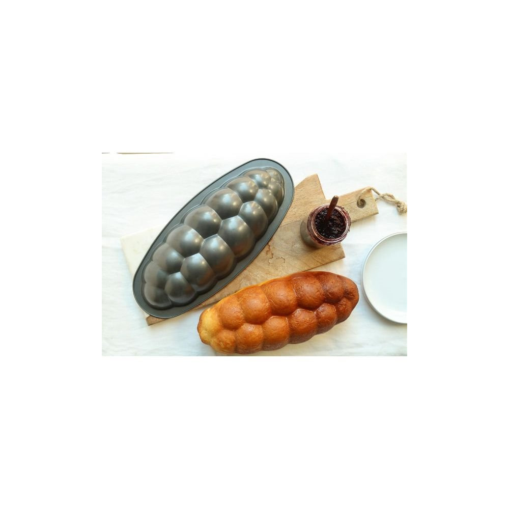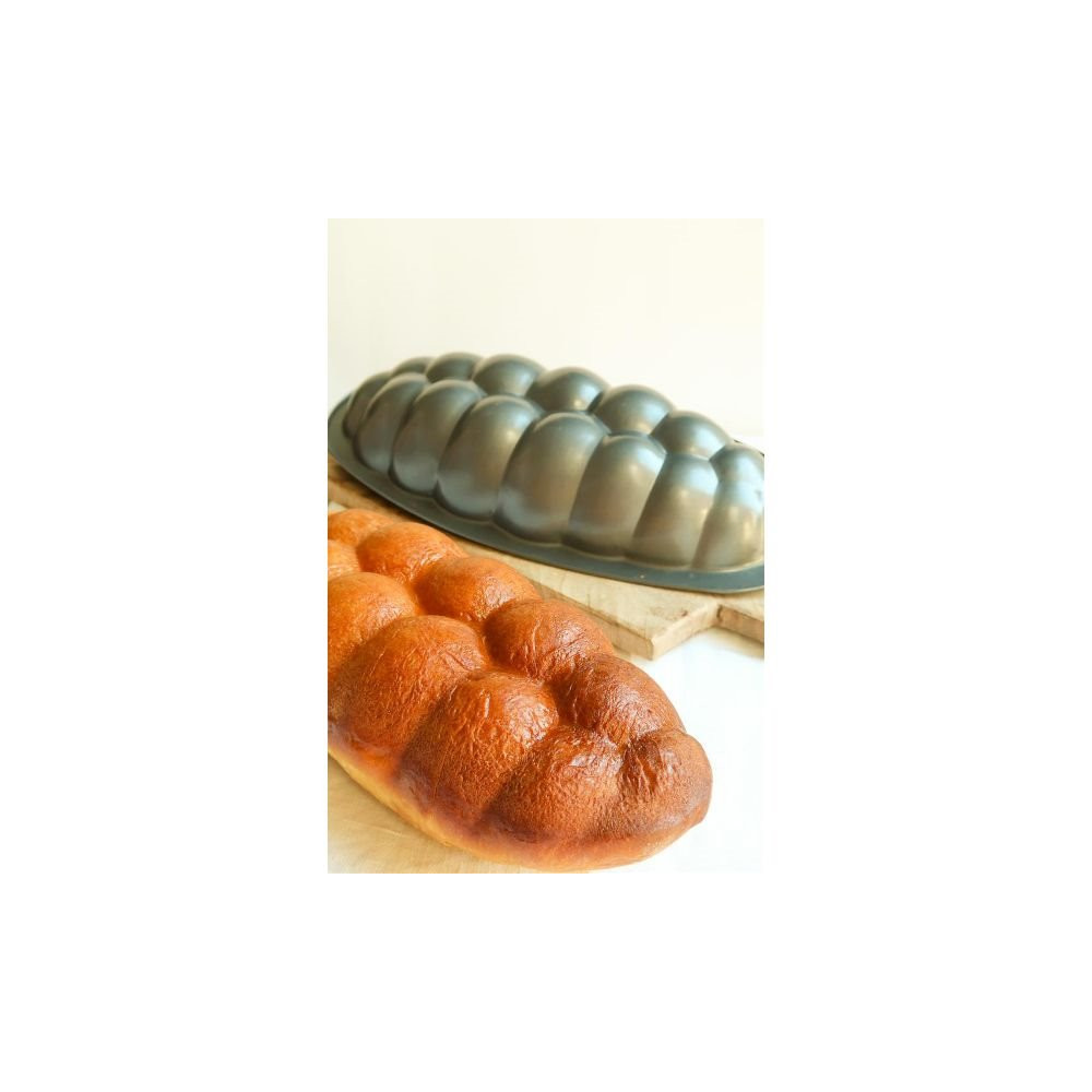 Fabriqué en acier revêtu, ce moule de 28 cm de longueur sur 18 cm de largeur assure une répartition homogène de la chaleur pour une cuisson régulière du cœur à la croûte. Son revêtement antiadhérent garantit un démoulage facile, sans risque d'abîmer la belle forme tressée de la brioche après cuisson.