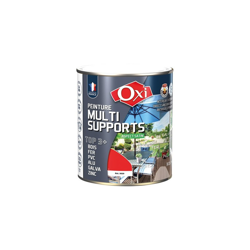 Existe en plusieurs coloris La peinture satin multi-support TOP3 de 2.5 L en coloris rouge vif RAL3020 de la marque Oxi est destinée à la décoration et la protection de nombreux matériaux bois, fer, PVC, métaux non ferreux, intérieurs et extérieurs. TOP3+ est une formule solvantée composée de résines de qualité supérieure et renforcée grâce à la « RUSTOL Technology ». Sur BOIS, TOP3+ est microporeux et protège de l'humidité, il s'oppose, sans cloquer, au vieillissement et à la dégradation des bo