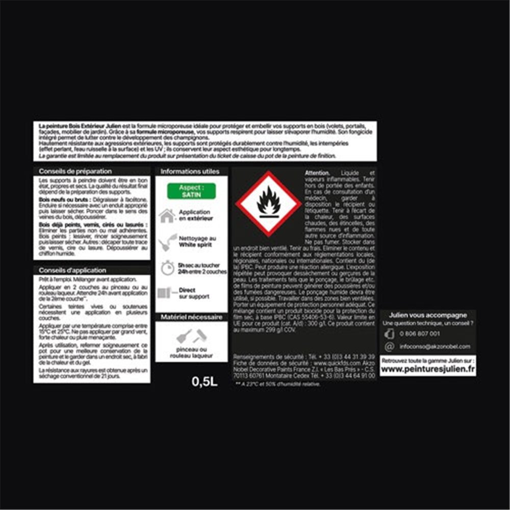 La peinture bois microporeuse Julien coloris noir en format 0,5 L est la solution professionnelle pour protéger durablement vos menuiseries et boiseries extérieures. Sa formule microporeuse satin crée une barrière efficace contre les agressions climatiques tout en laissant respirer le bois, évitant ainsi le cloquage et le décollement prématuré du film de peinture.