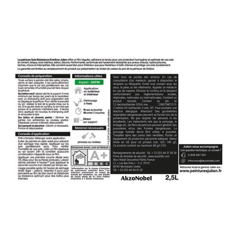 La peinture Sols Extrême JULIEN en 2,5 L coloris blanc Base White est la référence pour les sols soumis à des contraintes mécaniques et chimiques intenses. Formulée pour offrir un film régulier, adhérent et tendu, elle garantit une protection homogène et optimale sur une grande variété de supports : ciment, brique, bois, béton et bitume.