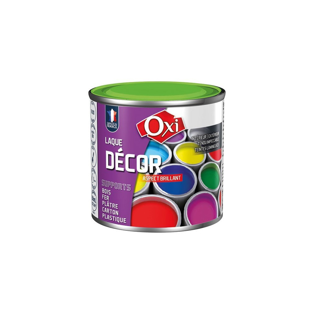 Existe en plusieurs coloris La laque décor aspect brillant de 60 mL en coloris vert pomme de la marque OXI est multi-supports. Elle permet de décorer et retoucher tous les objets, meubles, bibelots et menuiseries. Elle s'applique en intérieur et en extérieur sur le fer, bois, plâtre, cartons, plastiques et elle offre un fort pouvoir couvrant ainsi qu'une excellente résistance aux chocs et aux rayures. Pour 8 à 10 m²/L. Peinture prête à l'emploi. A appliquer au pinceau en une ou deux couches en f