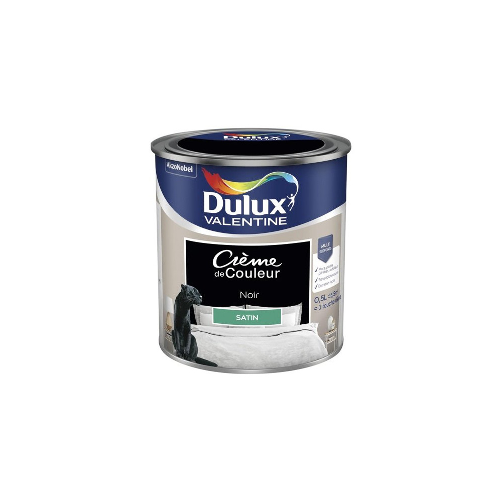 La formule crème en 0,5 L de Dulux Valentine dispose d'un pouvoir couvrant élevé, particulièrement travaillé pour les teintes extrêmes comme le noir. Sa finition satin crème révèle la profondeur du noir en lui conférant une légère brillance qui lui évite l'aspect mat parfois trop absorbant, tout en gardant un rendu élégant et sophistiqué.
