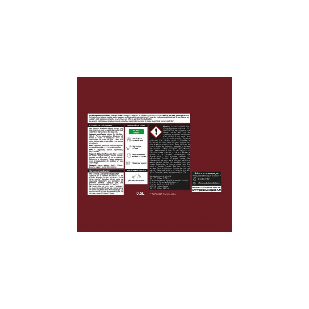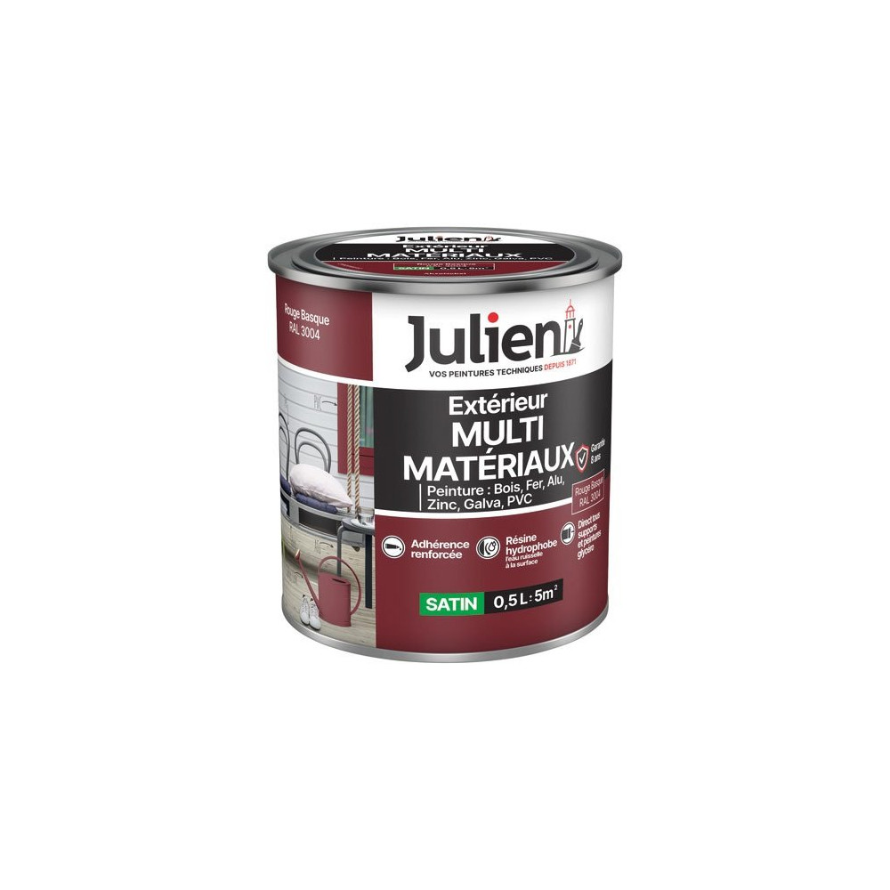 La peinture multi-matériaux Julien en rouge basque (RAL 3004) est une solution satin polyvalente et performante, conçue pour protéger durablement tout en apportant une teinte vive et affirmée à vos surfaces. Ce format économique de 0,5 litre est idéal pour les petits travaux de rénovation ou de mise en valeur d'éléments décoratifs.
