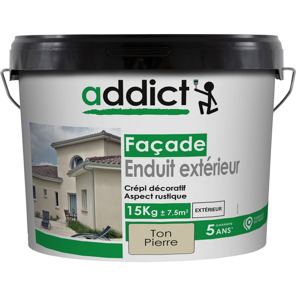 Crépi ton pierre pour façades à base de résine acrylique assurant la protection et la décoration des façades. C'est un enduit extérieur, un crépis décoratif d'aspect rustique. | Crépi pour surfaces verticales extérieures, il est idéale sur une façade en atmosphère rurale et urbaine. Addict crépi façade ton pierre est un produit qui convient aux enduits de liant hydrauliques, ciment et dérivés, béton, béton cellulaire, fibrociment, briques, panneaux préfabriqués de béton blanc ou gris préalablement imprimés.