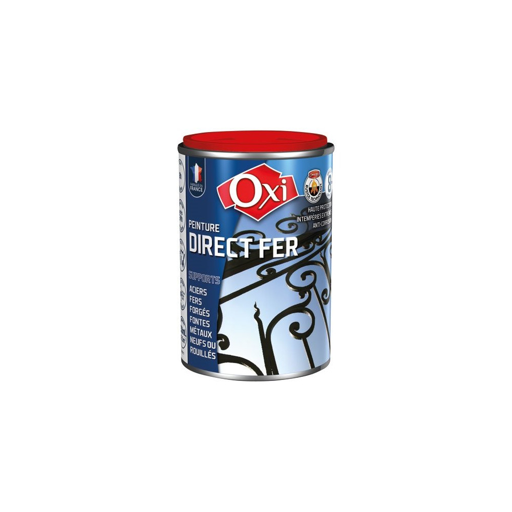 Existe en plusieurs coloris La peinture brillante Direct Fer de 250 mL en coloris rouge vif RAL3020 de la marque Oxi est est une peinture brillante, lisse destinée à la décoration des fers neufs ou anciens même rouillés sans sous-couche. Elle s’applique aussi bien en intérieur qu’en extérieur sur fers forgés, grilles, mobiliers de jardin, objets décoratifs, luminaires, objets anciens... Excellente protection antirouille. Très bonne résistance aux chocs et aux agressions extérieures. Peinture prê