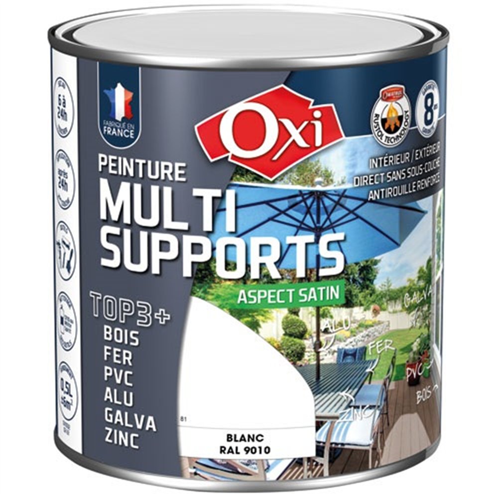 Existe en plusieurs coloris La peinture satin multi-support TOP3 de 500 mL en coloris blanc RAL9010 de la marque Oxi est destinée à la décoration et la protection de nombreux matériaux bois, fer, PVC, métaux non ferreux, intérieurs et extérieurs. TOP3+ est une formule solvantée composée de résines de qualité supérieure et renforcée grâce à la « RUSTOL Technology ». Sur BOIS, TOP3+ est microporeux et protège de l'humidité, il s'oppose, sans cloquer, au vieillissement et à la dégradation des bois