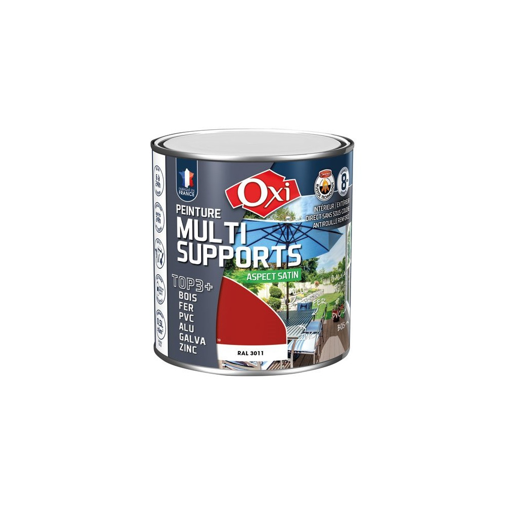 Existe en plusieurs coloris La peinture satin multi-support TOP3 de 500 mL en coloris bordeaux RAL3011 de la marque Oxi est destinée à la décoration et la protection de nombreux matériaux bois, fer, PVC, métaux non ferreux, intérieurs et extérieurs. TOP3+ est une formule solvantée composée de résines de qualité supérieure et renforcée grâce à la « RUSTOL Technology ». Sur BOIS, TOP3+ est microporeux et protège de l'humidité, il s'oppose, sans cloquer, au vieillissement et à la dégradation des bo